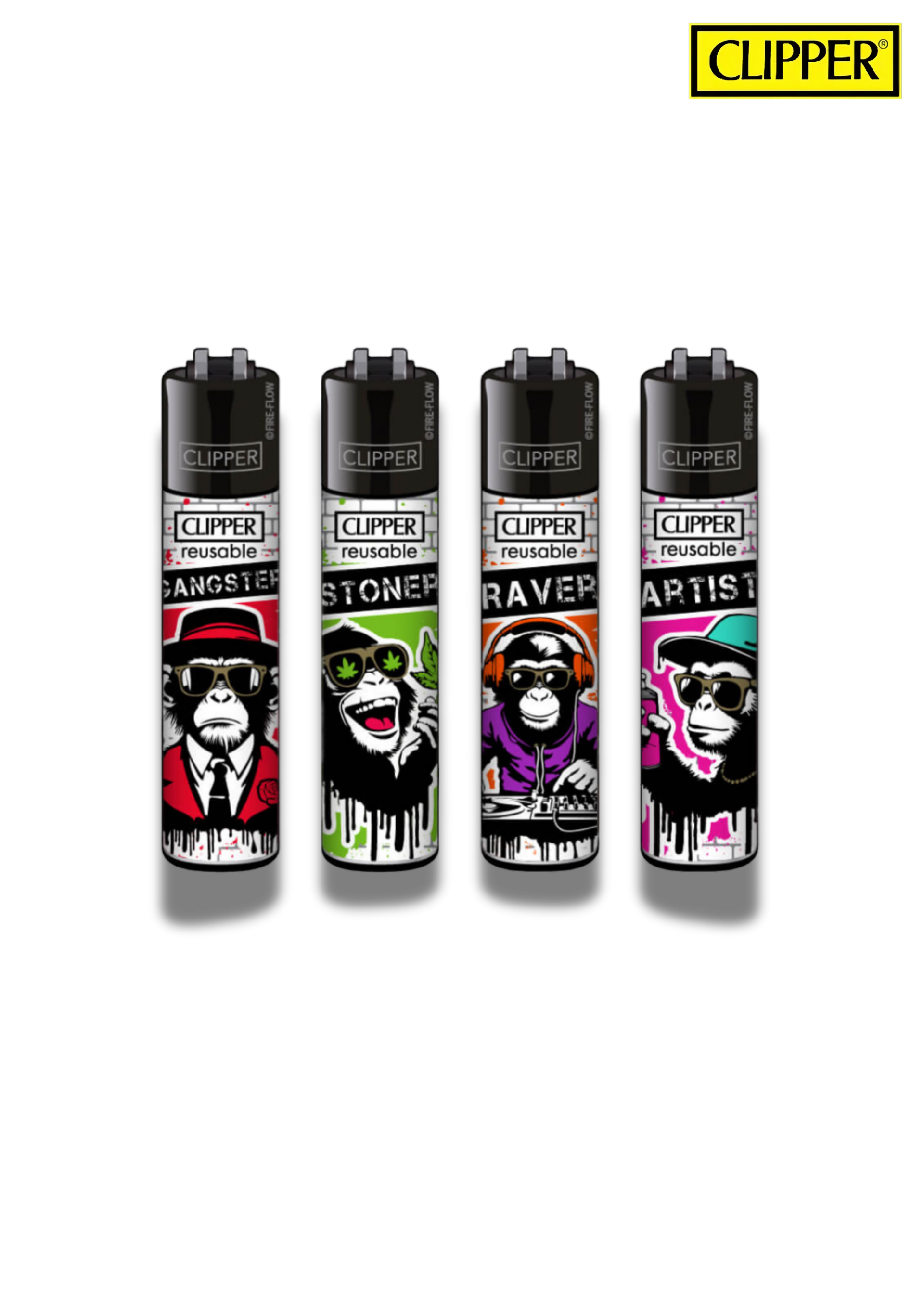 Briquets clipper classic de la série Urban Chimps mettant en avant des illustrations de chimpanzés stylisés, souvent dans des postures humaines ou avec des accessoires urbains, dans un esprit street art humoristique.