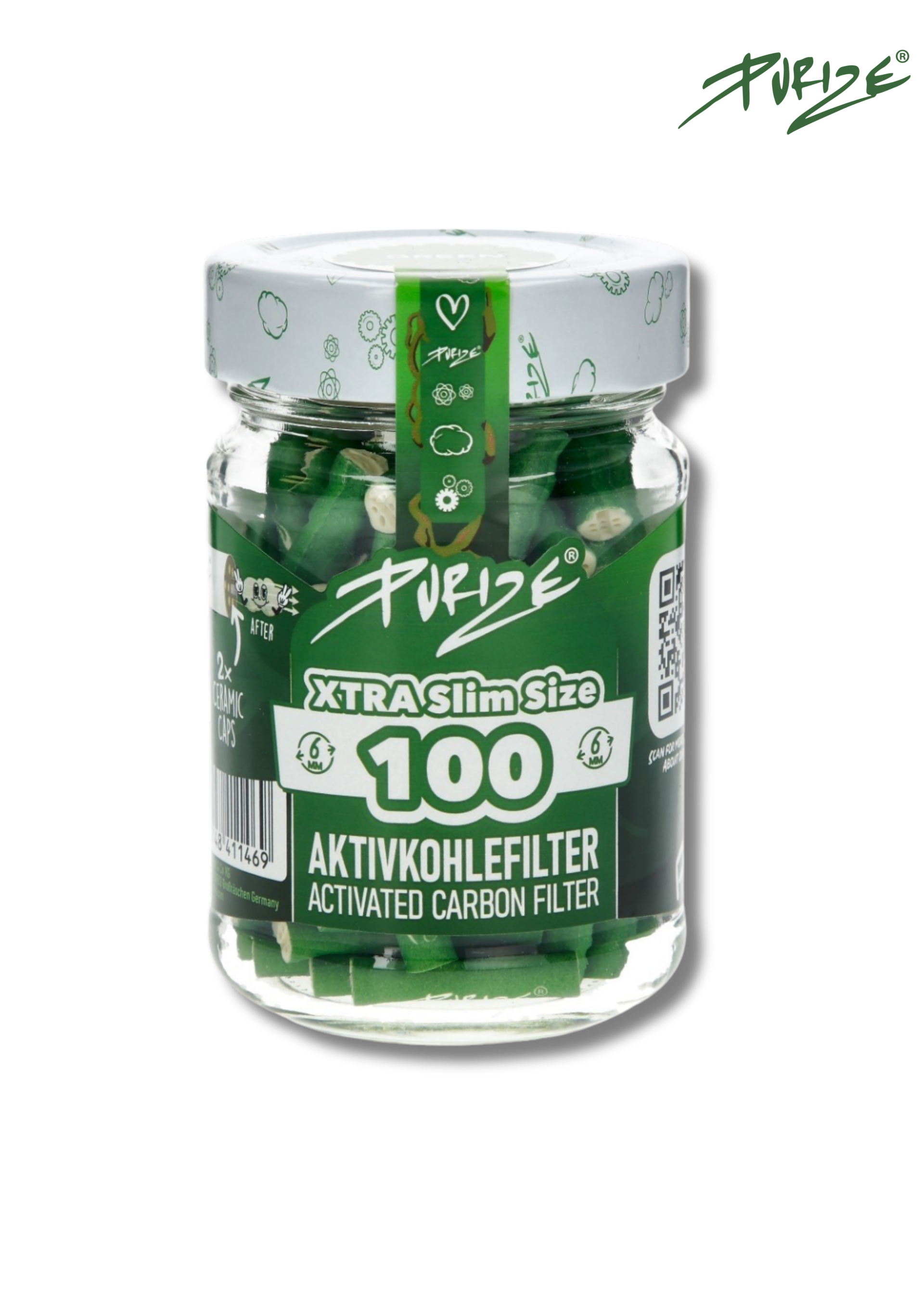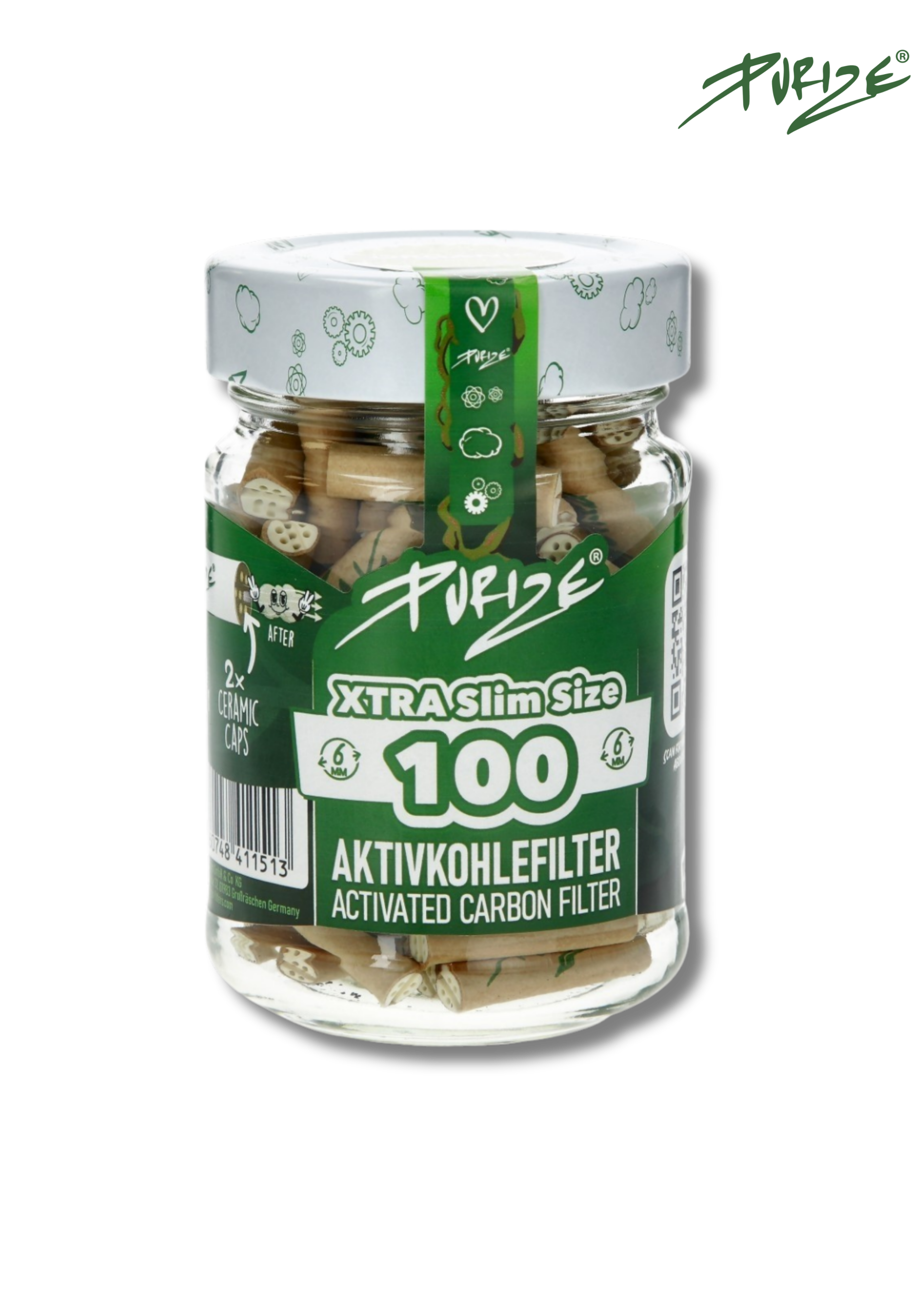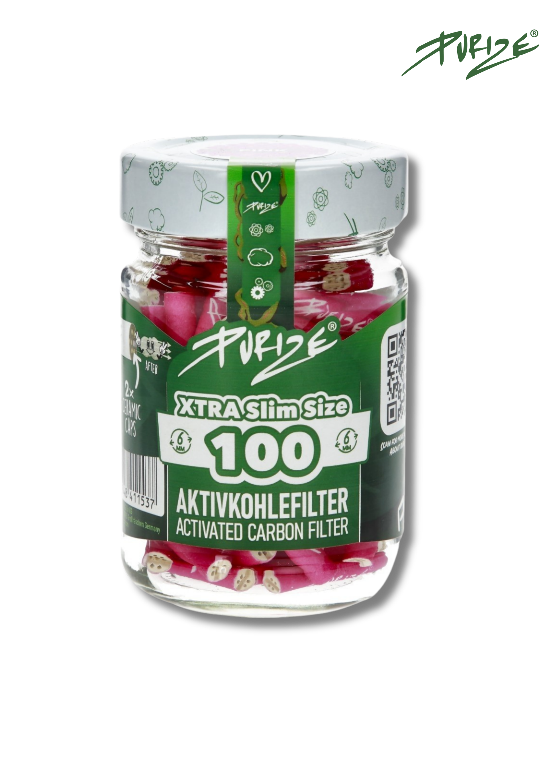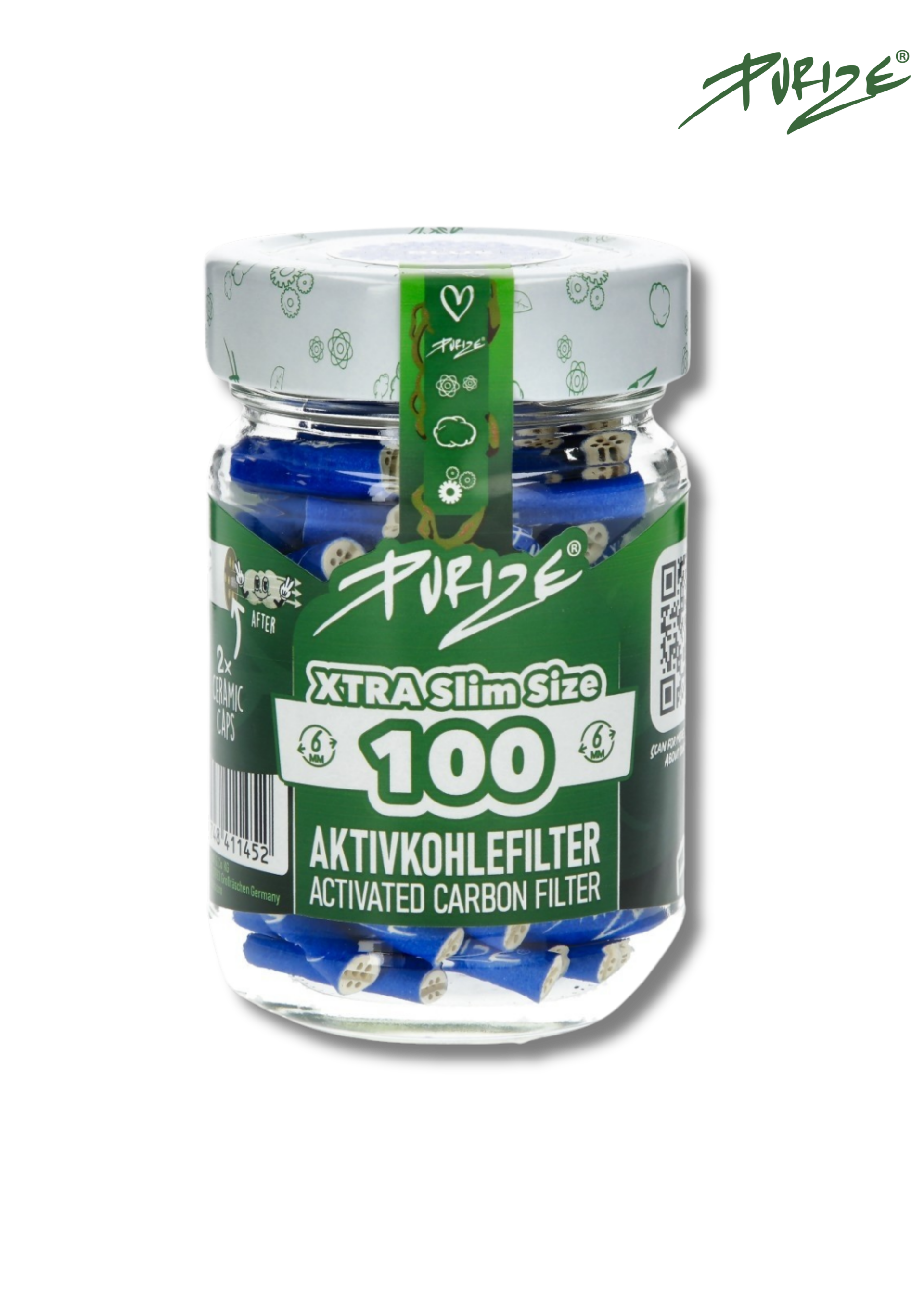 Le bocal Purize regroupe 100 filtres à charbon actif XTRA Slim Size dans un pot en verre recyclé, conçu pour protéger les filtres de l’humidité et faciliter leur conservation.