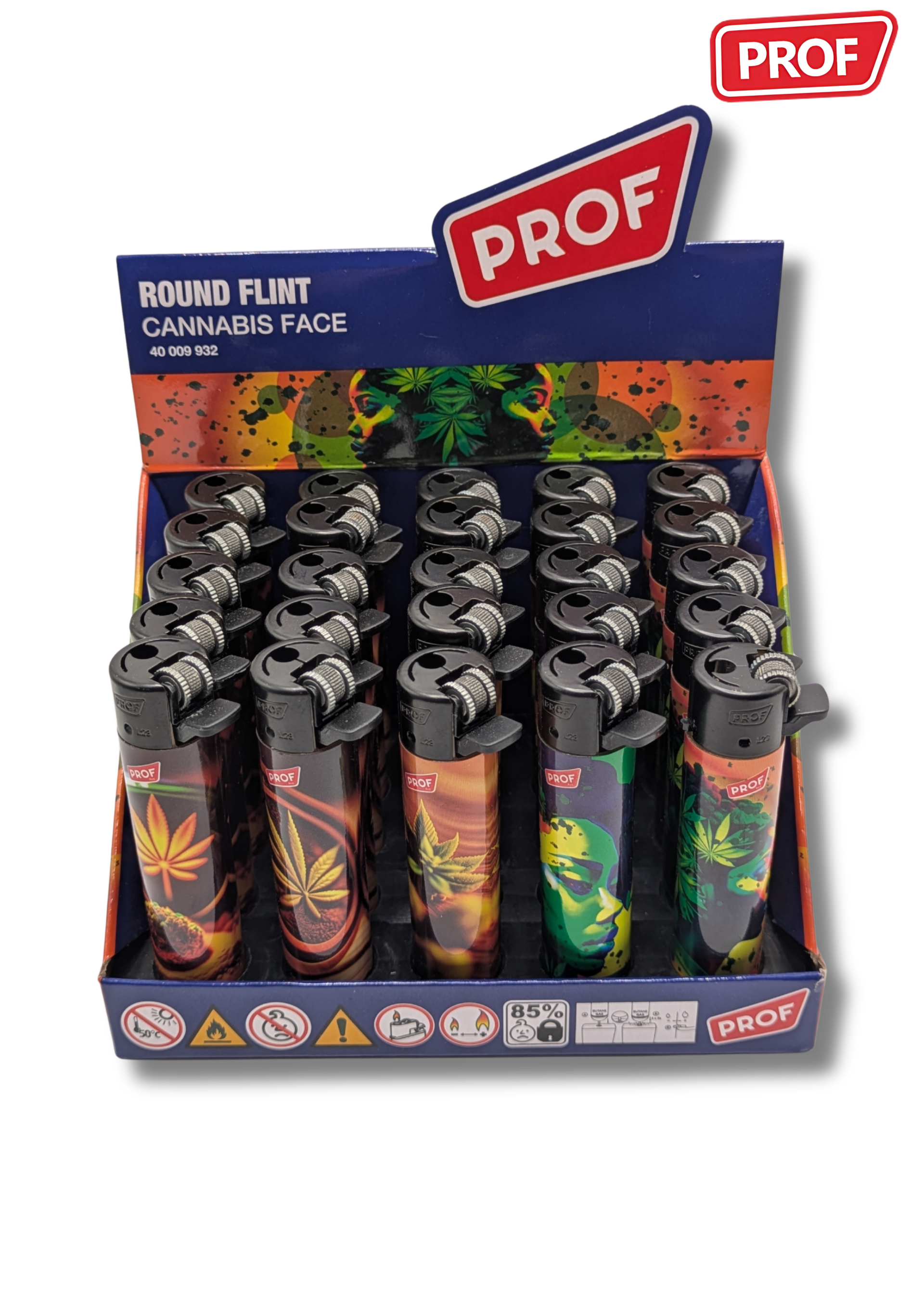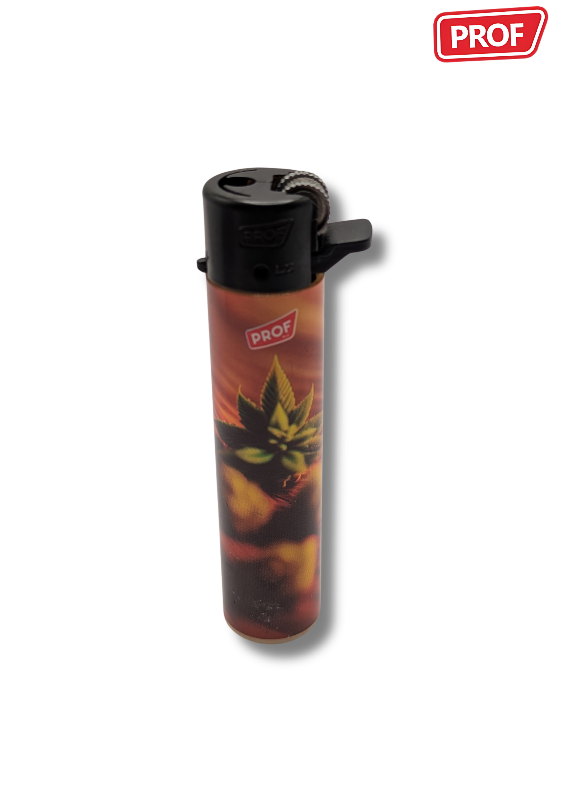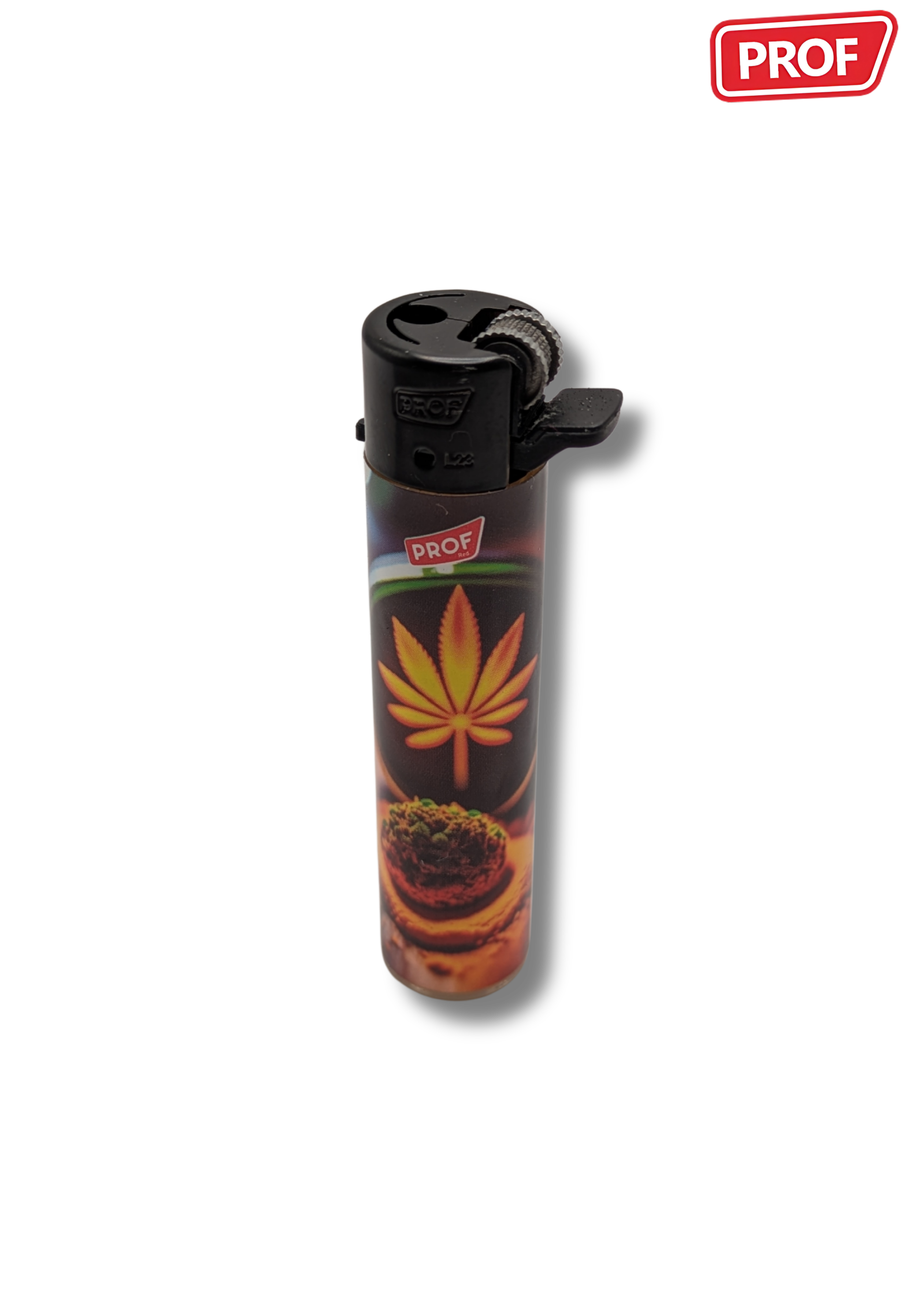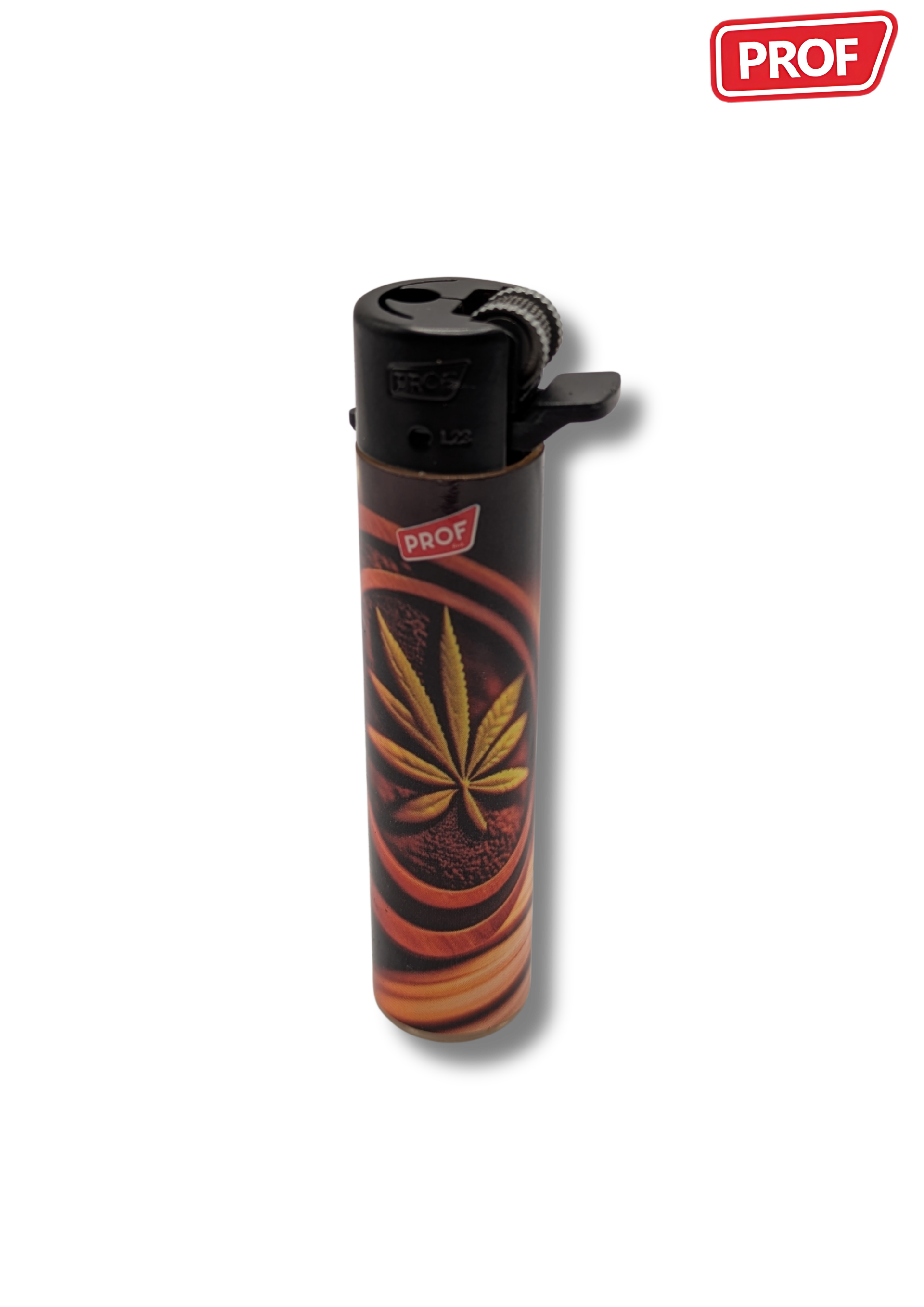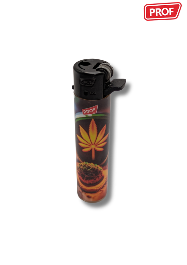 Les briquets Prof "Leaf #1" se distinguent par leur design graphique inspiré de la feuille de cannabis, décliné dans une série de visuels colorés et stylisés.