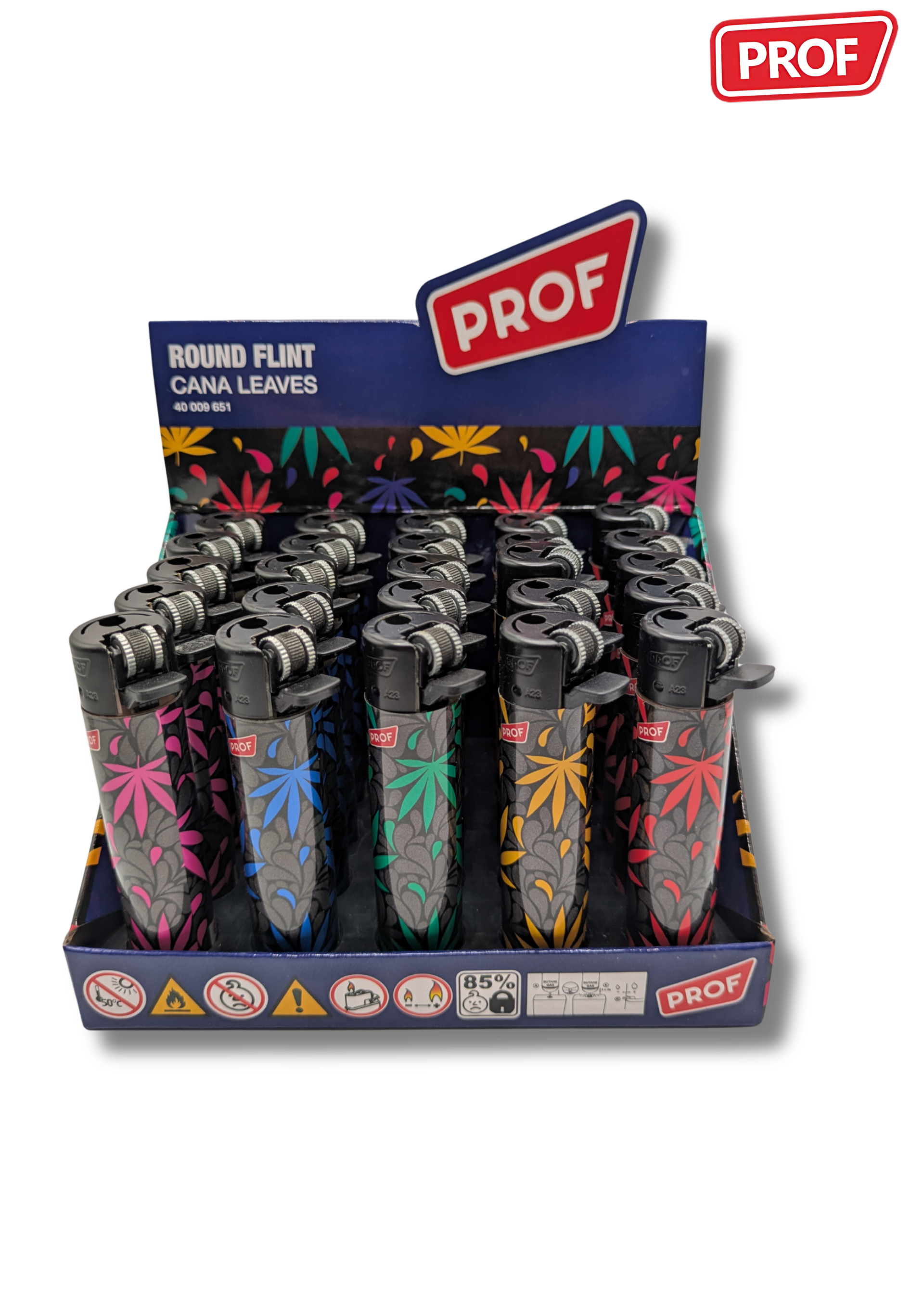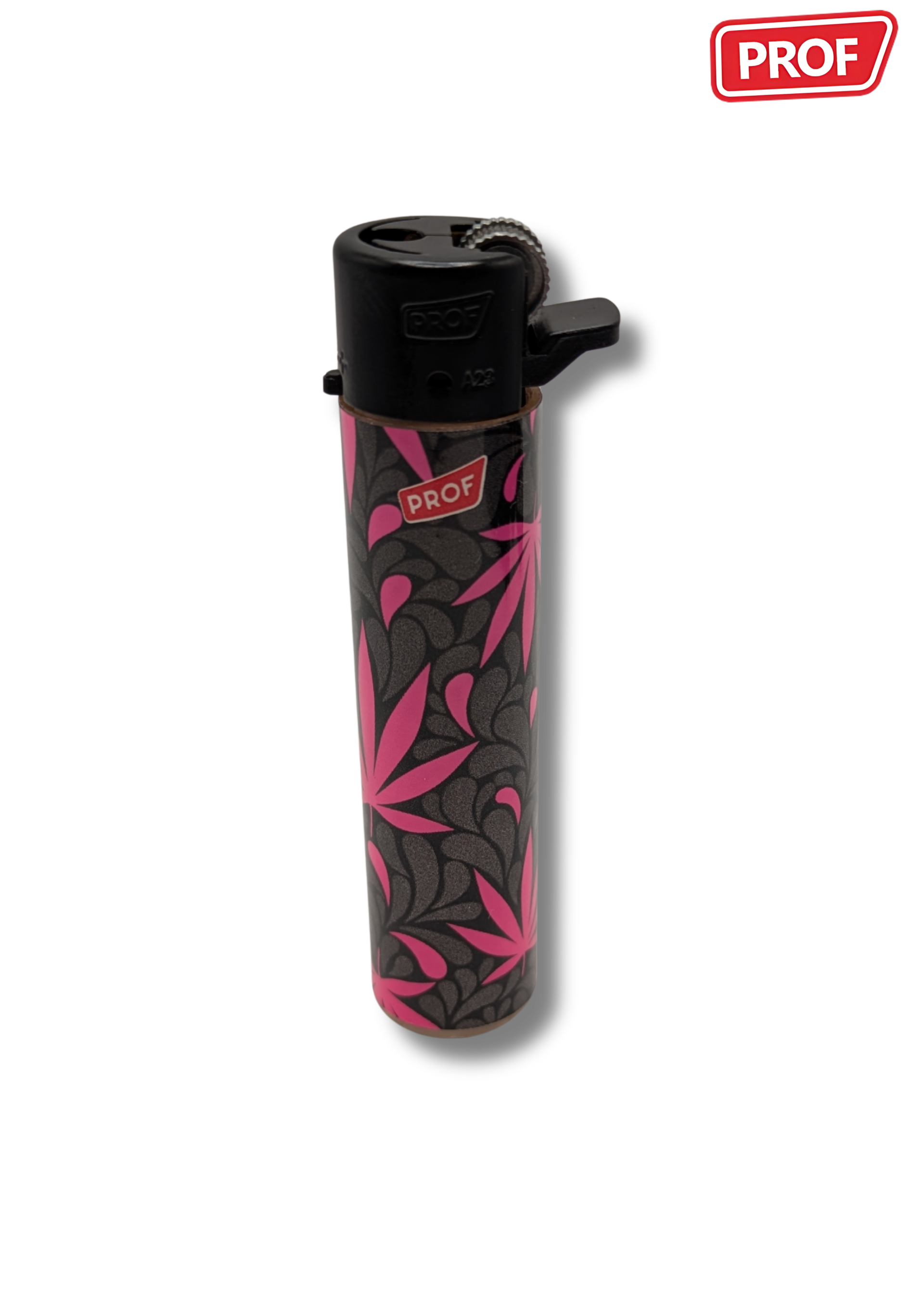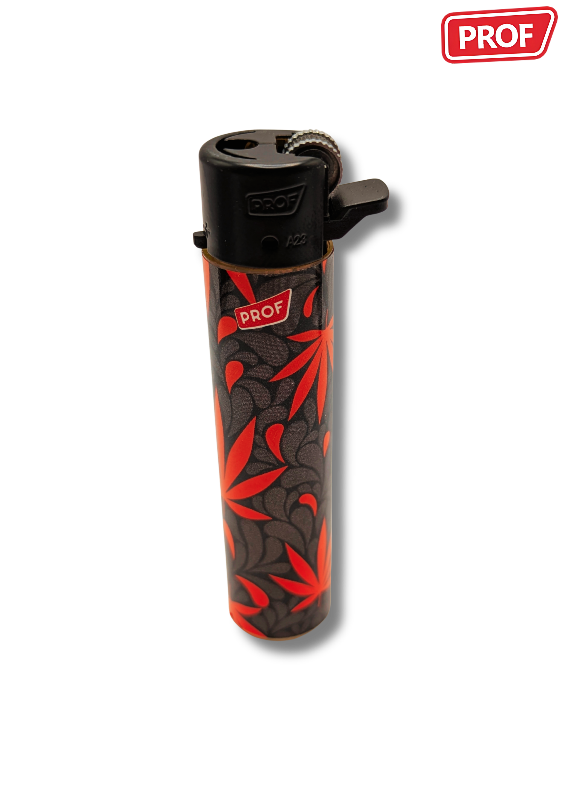 Les briquets Prof "Leaf #2" se distinguent par leur design graphique inspiré de la feuille de cannabis, décliné dans une série de visuels colorés et stylisés.